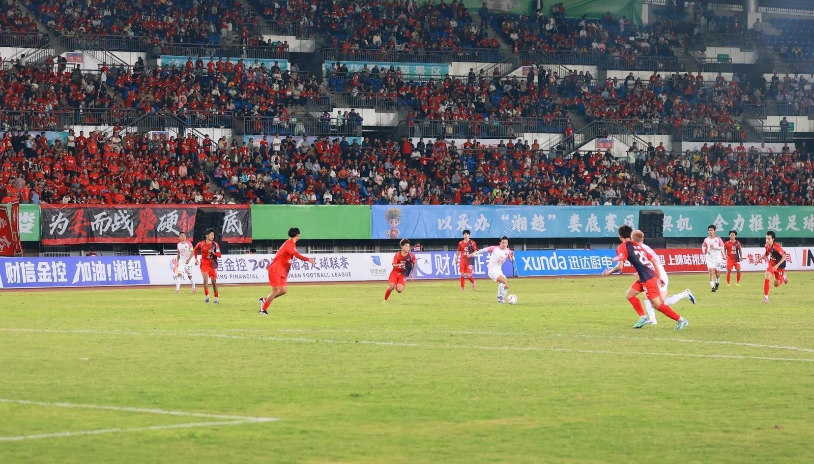 9月20日晚,“湘超”常德隊客場對陣主隊婁底隊,21687名球迷現場為兩隊搖旗助威。依靠26號球員夏宇航的進球,常德隊1:0擊敗對手,取得兩連勝。