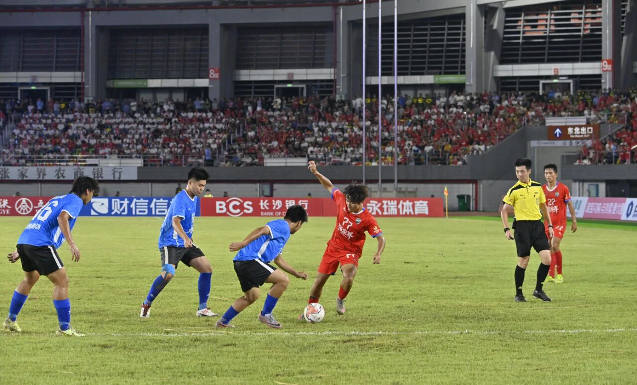 19點38分,開場哨聲吹響,雙方迅速進入狀態,展開激烈拼搶。第22分鐘,永州隊打破僵局,以1-0開局。隨后張家界隊緊跟而上,6號丁嘉文抓住機會,一腳彎腰低推,成功將比分扳平為1:1。下半場開場僅一分鐘,張家界隊就強勢反超比分,踢進一球,第74分鐘再進一球。第83分鐘永州隊扳回一球。傷停補時 階段,永州隊頭球破門,最終將比分鎖定在3:3平,雙方握手言和。