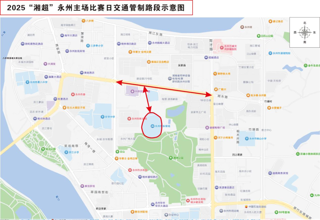 三、管制措施1.停車管制。2025年9月21日17時30分至23時,永州市體育中心內停車場、湘永路與雙洲路口至湘永路與育才路口全路段兩側人行道及公共停車場,除經組委會批準的服務保障賽事工作的特種車輛外,禁止其他所有車輛停放(含非機動車)。2.通行管制。2025年9月21日17時30分至21時30分,湘永路與雙洲路口至湘永路與育才路口僅允許公交車通行;21時30分-23時全路段禁止所有社會車輛(含非機動車)通行。四、停車建議1.機動車停放區域與路段(比賽日當天17時30分-23時):①湘江西路全路段(除路口、婚紗草坪廣場前后200米范圍內及大橋匝道等路段外)。②湘江東路宋家洲紅綠燈路口——瀟湘大橋橋下路段兩側、翠竹路全路段兩側、育才路全路段兩側允許臨時停放。③河東城區的社會停車場(除湘永路管制道路內的停車場外)免費開放。2.摩電車輛停放區域與路段:除湘永路與雙洲路口——湘永路與育才路口路段兩側人行道外,其他路段人行道均可停放。