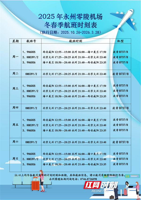 紅網時刻新聞10月21日訊(通訊員 蔣超)10月26日,永州機場將正式開啟2025-2026年冬春航季,執行周期至2026年3月28日。本次航季航班計劃在夏秋季基礎上進行了優化調整,為永州旅客出行帶來新變化。