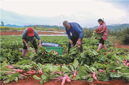 9月22日,新田縣驥村鎮李家山村,村民在采收紅皮蘿卜,銷往粵港澳大灣區蔬菜市場。近年來,新田縣以土地富硒資源優勢為依托,積極對接粵港澳大灣區“菜籃子”工程,以“公司+基地+農戶”的模式,大力發展訂單特色蔬菜產業,保障粵港澳大灣區蔬菜市場供給,增加農民收入?!①F雄 攝