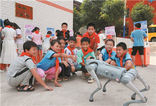 9月10日,新田縣三井學校,學生在與機器狗互動。當天,縣科協邀請市科普大篷車到該縣開展“科普進校園”活動,通過組織學生參觀科普展板、體驗科普儀器等活動,讓孩子們近距離感受科技的魅力,激發他們創新創造意識和科學探索精神?!①F雄 攝