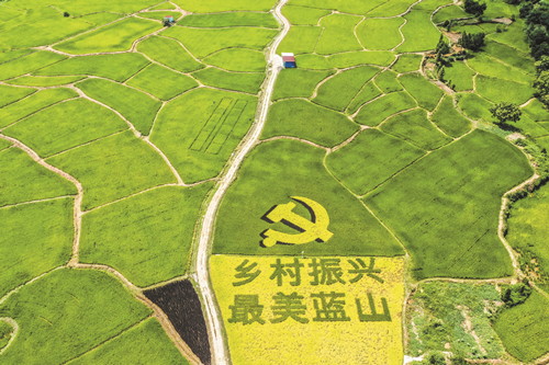 9月14日,藍山縣塔峰鎮竹市村,長勢良好的彩色水稻構成了一幅鄉村振興主題稻田畫,成為鄉村田園里的一道亮麗風景?!∨砣A 攝